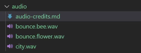 if(World.time(world) > last_bounce + 0.25) { last_bounce = World.time(world) Audio.play(Asset.audio("audio/bounce.bee"))}We also play an additional sound when we bounce on the flower. The sounds combining is intentional, as it should create a nice mix of sound in this case.