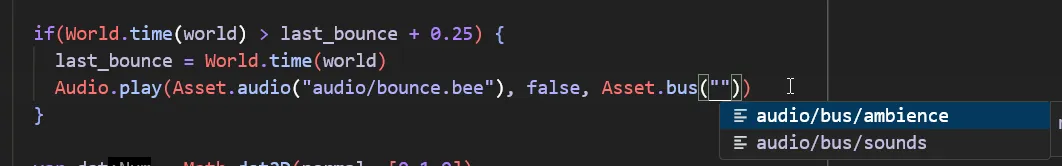 if(World.time(world) > last_bounce + 0.25) { last_bounce = World.time(world) Audio.play(Asset.audio("audio/bounce.bee"), false, Asset.bus("audio/bus/sounds"), 1)}And the ambience: