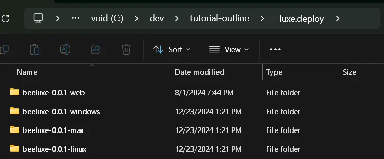 The contents of the folder is a versioned build separated by build target/platform. This makes it easy to zip a folder (e.g beeluxe-0.0.1-windows -> beeluxe-0.0.1-windows.zip) and upload the file directly or share with a friend.