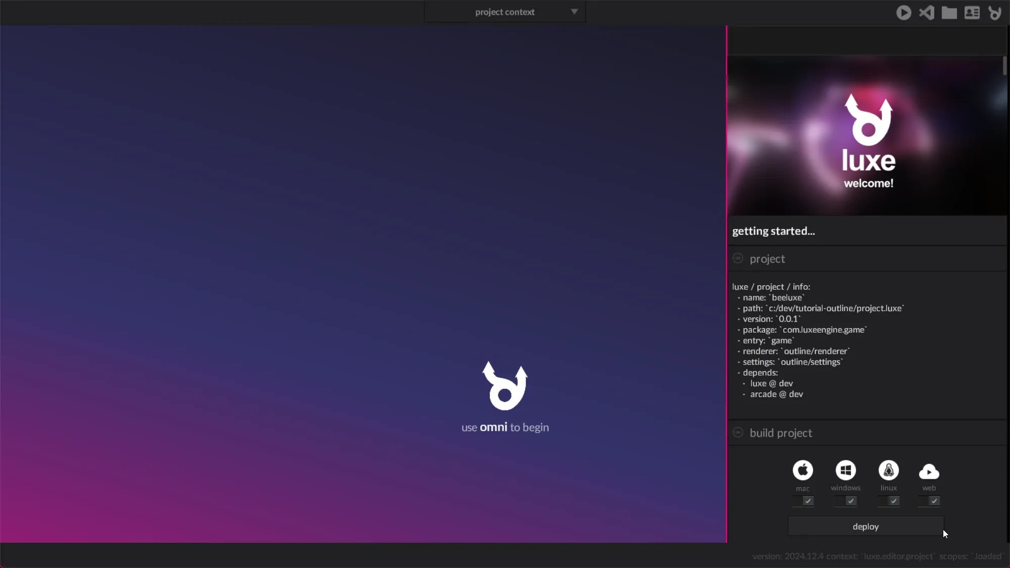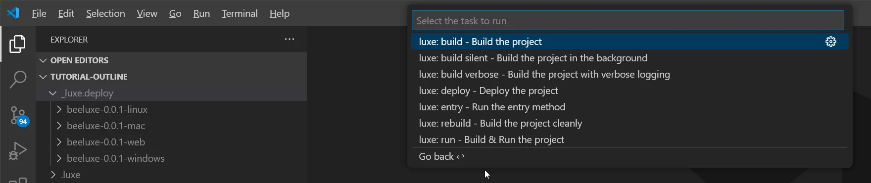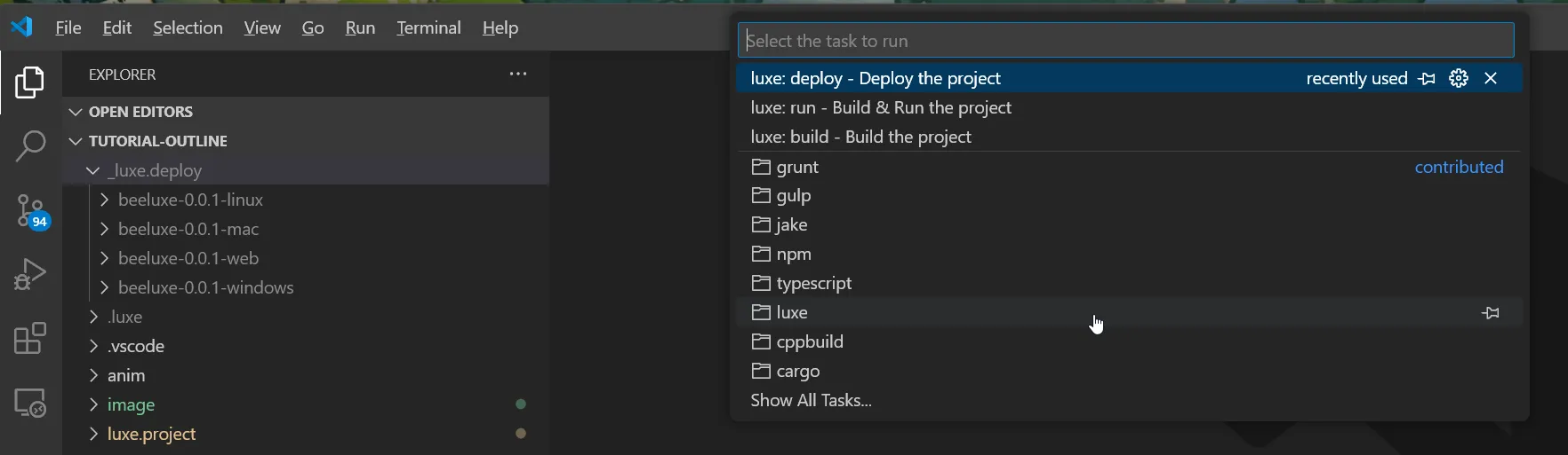 And inside the luxe folder, we have some options, one of which is luxe: deploy - Deploy the project.