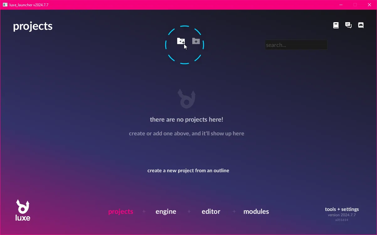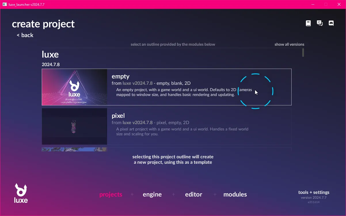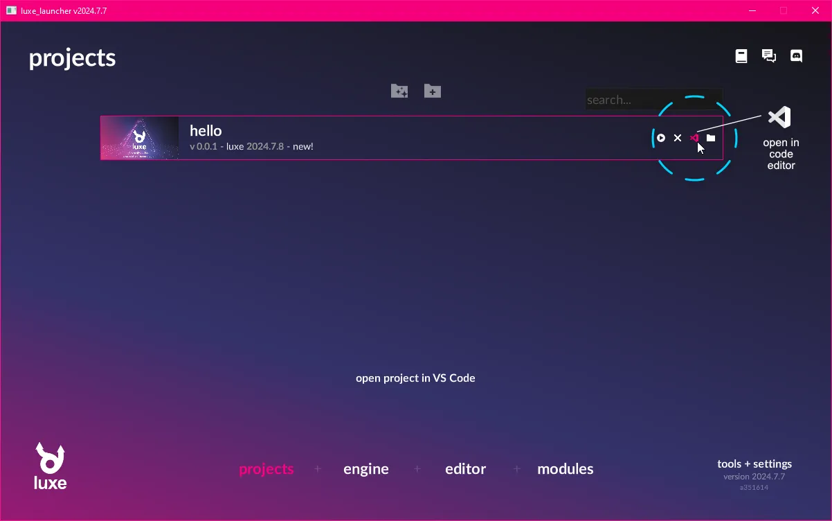 Section titled “Stepping stones”The luxe launcher is used for managing projects, engine versions and modules.