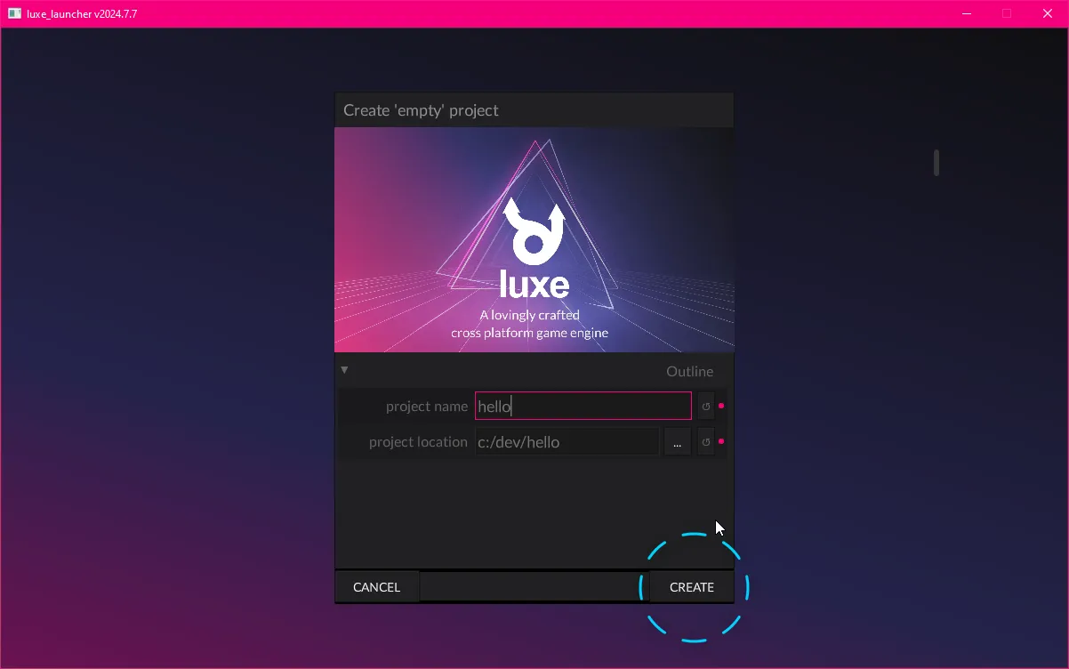 Section titled “Creating a new project”In the luxe launcher application, we’ll find a create button in the middle near the top of the window. Click this to choose a project outline to use for the new project.