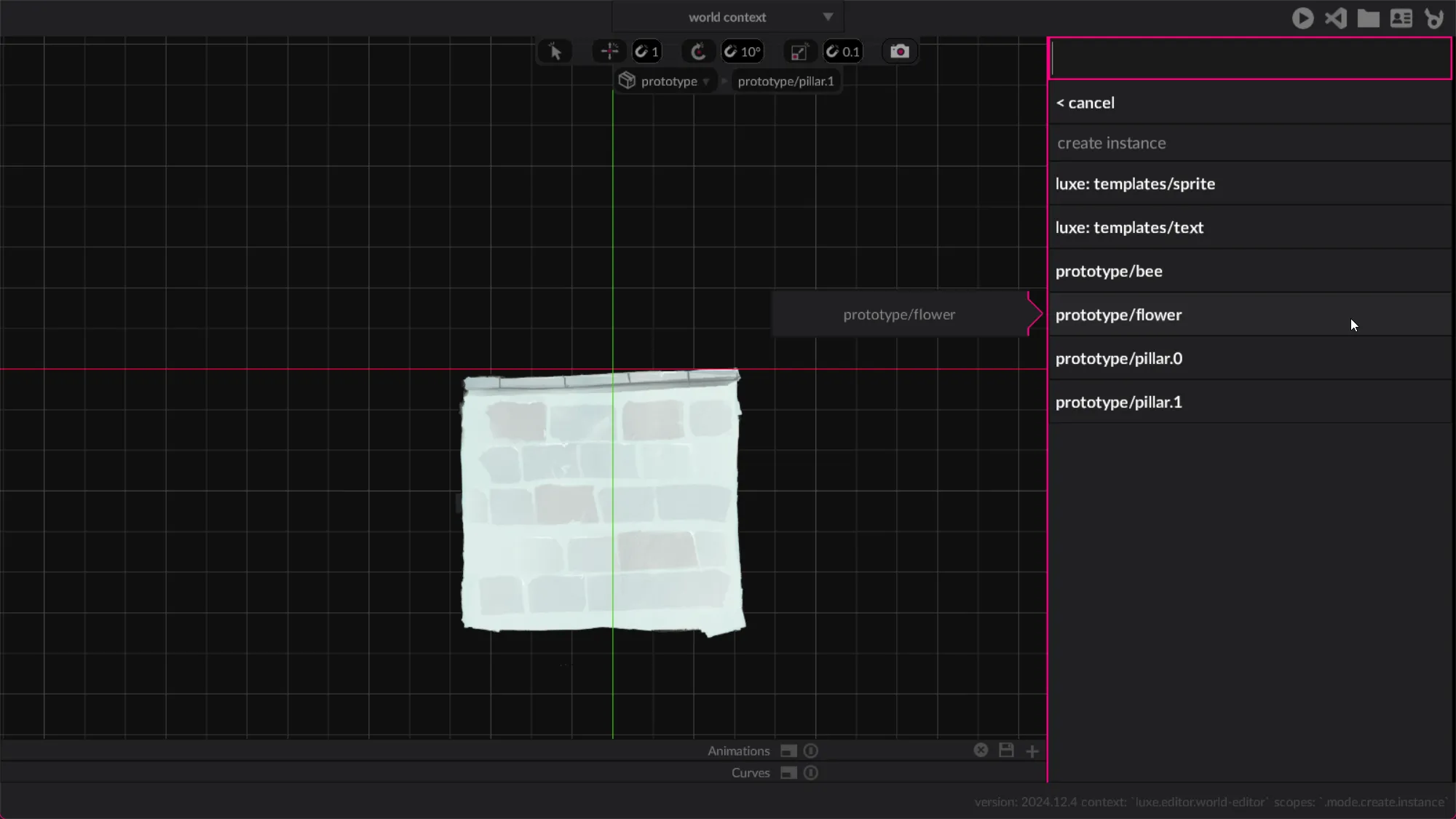 The last piece we’ll do step by step, is creating an instance of the flower prototype. The flower is part of the challenge in the game, to bounce on it, so we’ll create one in our pillar. The game already has a prototype created and ready to use, so all we need to do is make an instance of it.