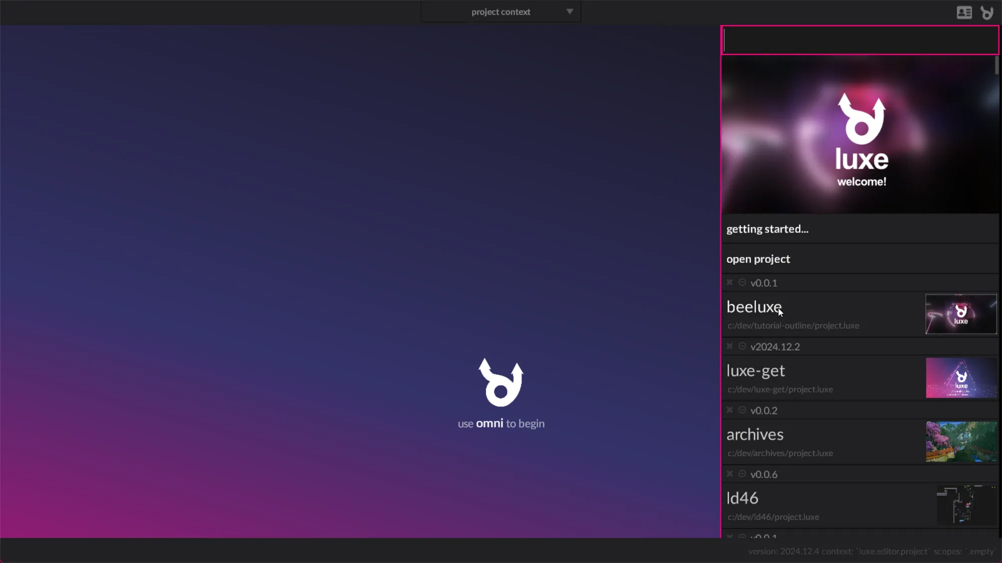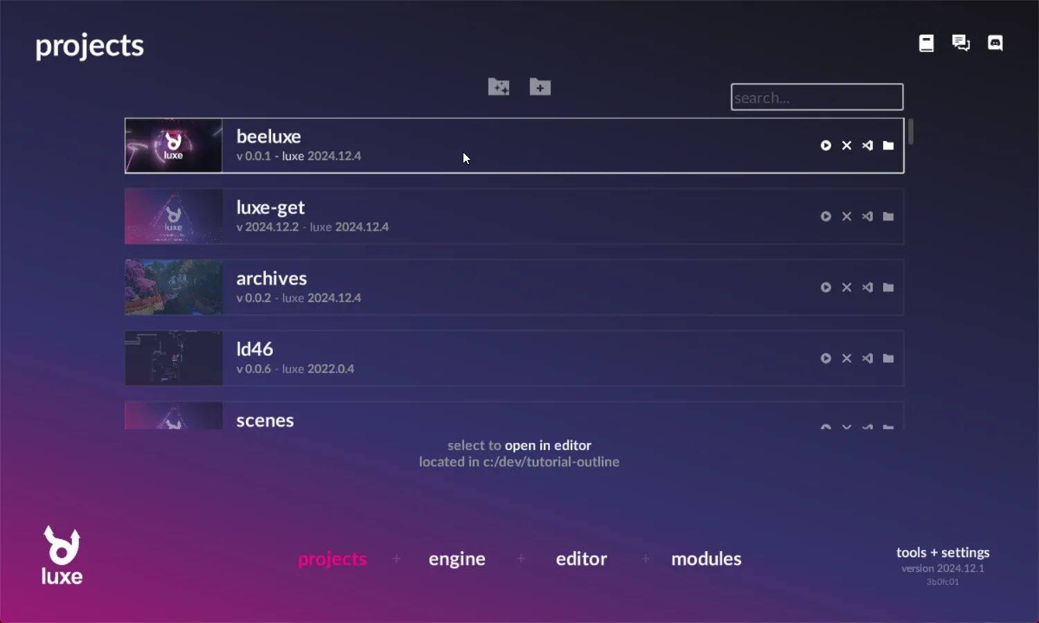 The typical workflow for opening a project in the editor is to click the project in the luxe launcher. As you hover a project it will show the path and ‘select to open in editor’ at the bottom.