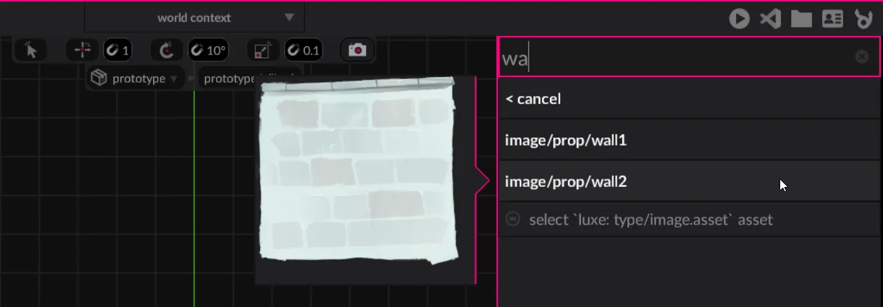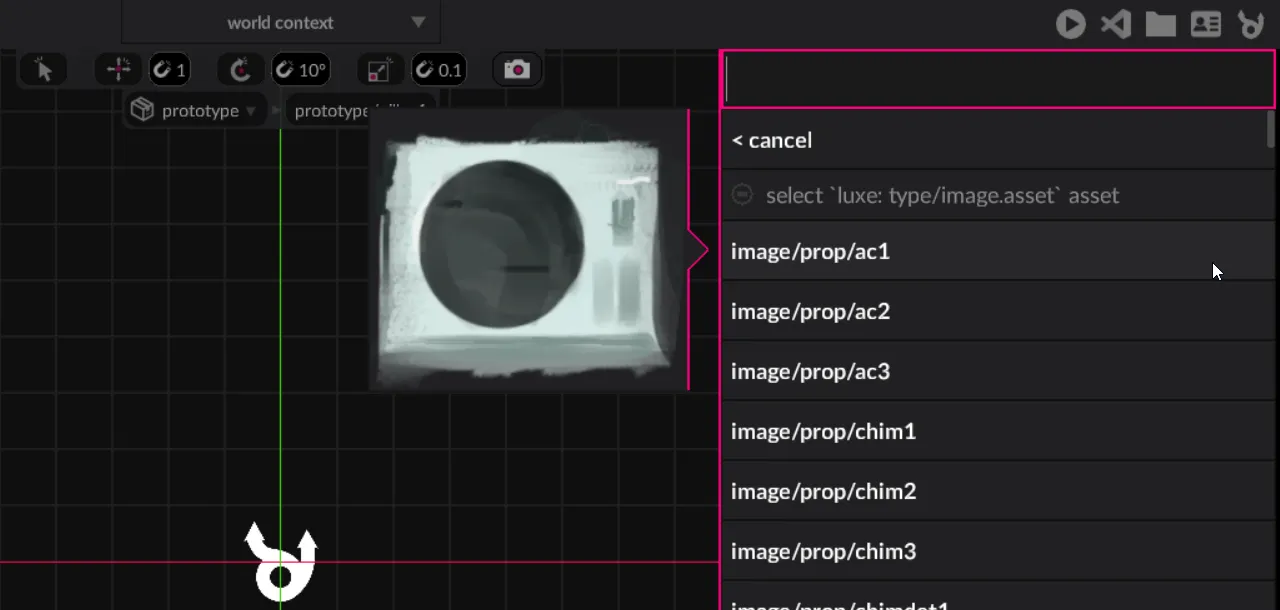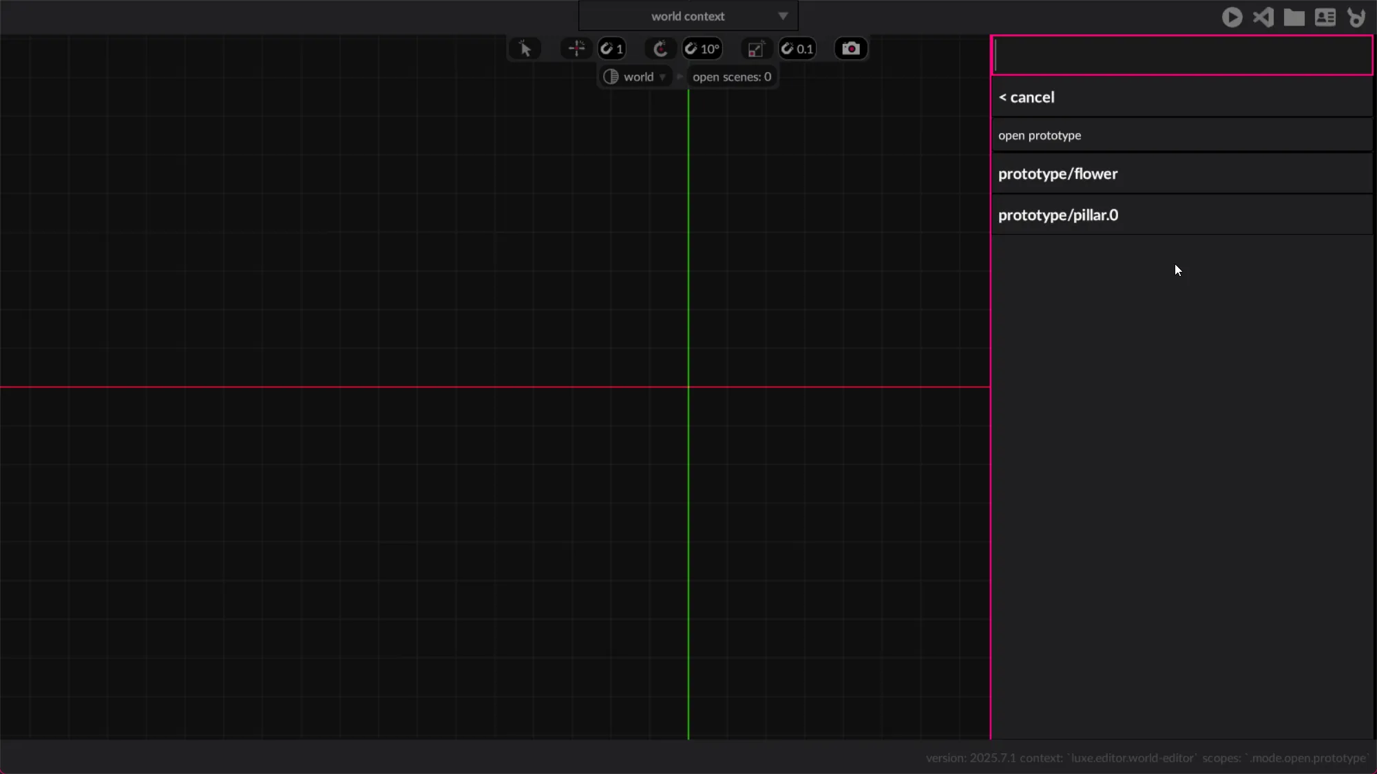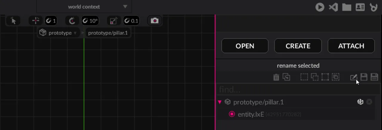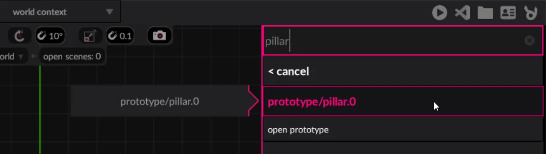 When we open a prototype (or create one) it does so in it’s own world. There’s a unique world for each one that’s open, and one primary world for the open scenes. So how do we get back to the main world editor? That’s what these little breadcrumbs are here for: