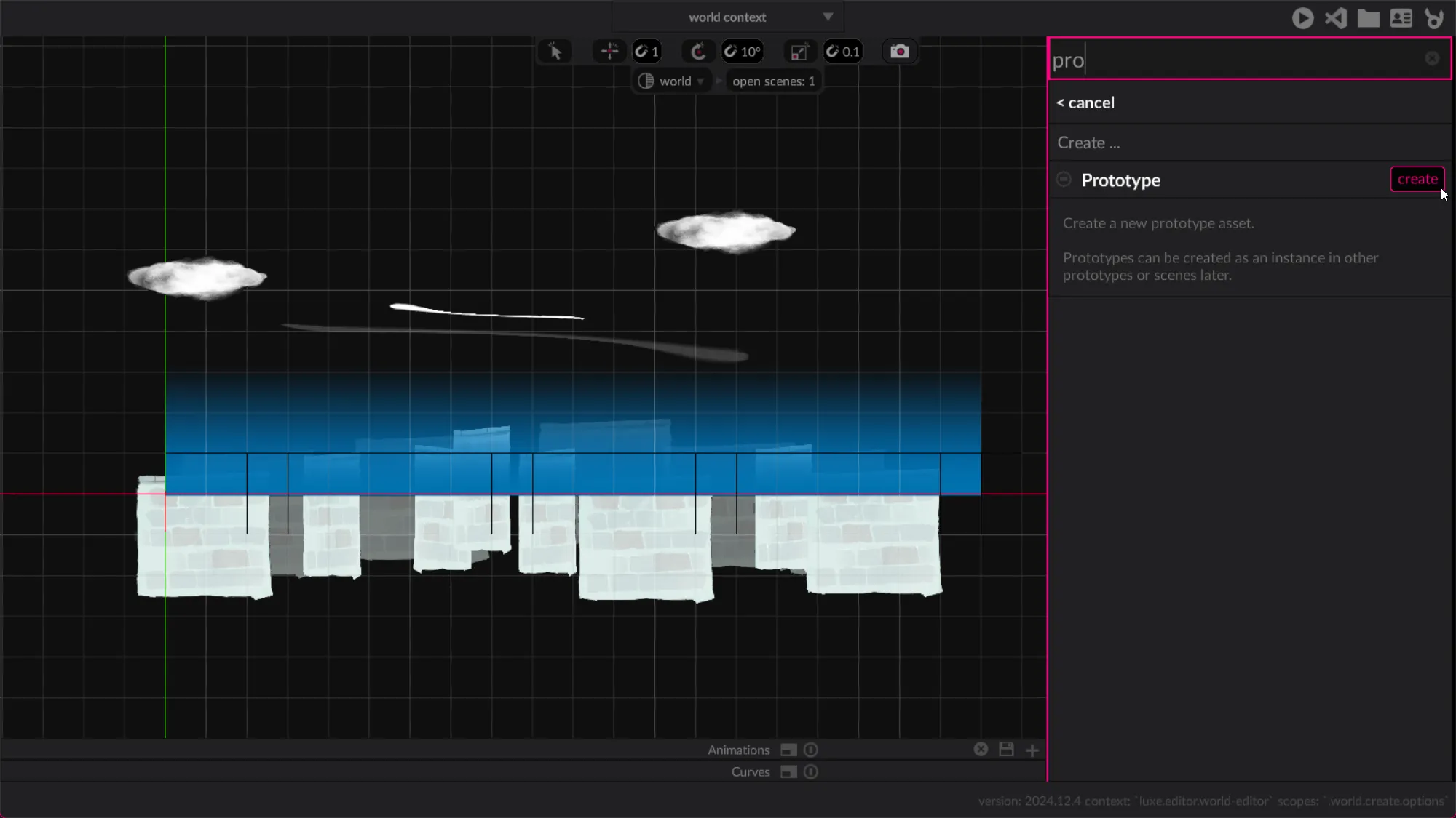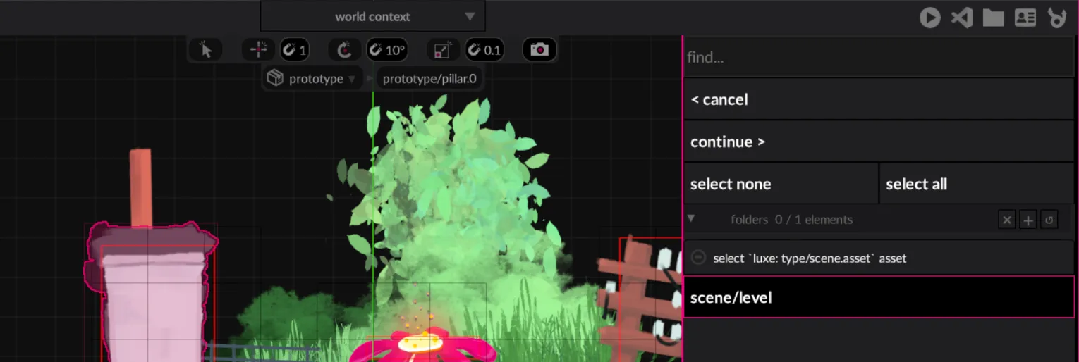 The world editor is a context that you work in when editing levels or scenes. Creating tilemaps, managing assets, changing settings: these are all different contexts, as they are contextually different things, and don’t overlap with editing scenes. So we put them in separate contexts that you can switch between quickly.