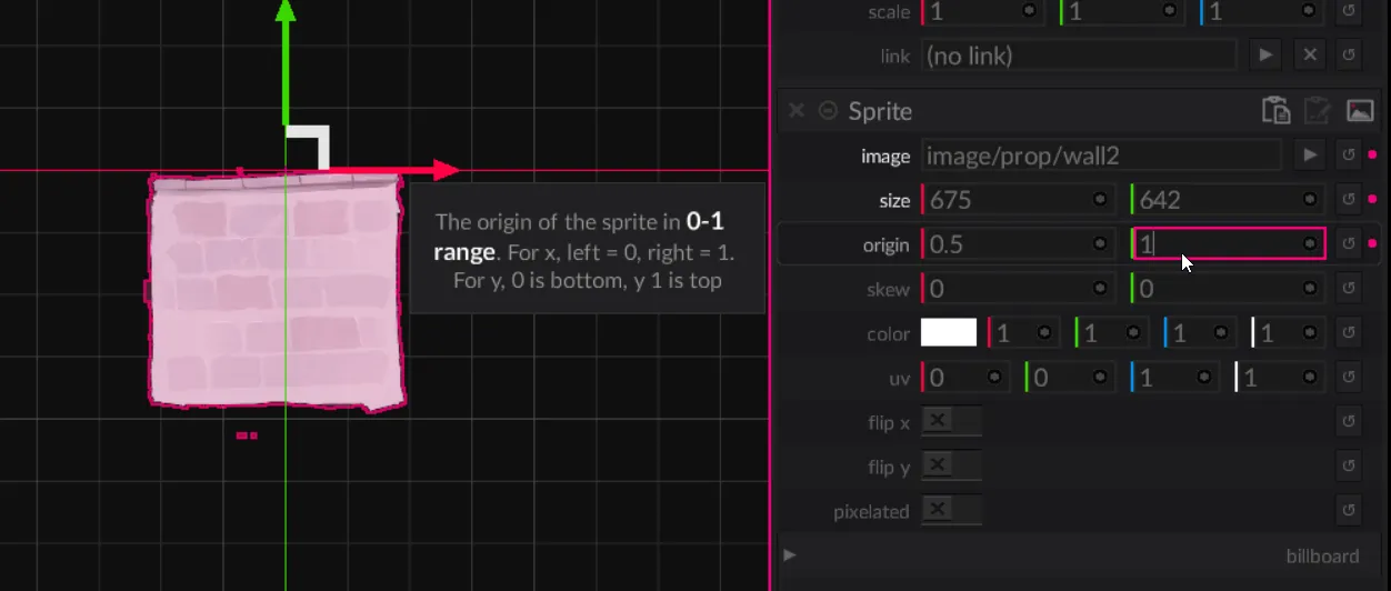 0 is left, 0.5 is center, and 1 is right.0 is bottom, 0.5 is center, and 1 is top.If we change the y value of the origin to 1, we can set the Y position on the Transform back to 0. This makes the top of our pillar align with the red axis as well!