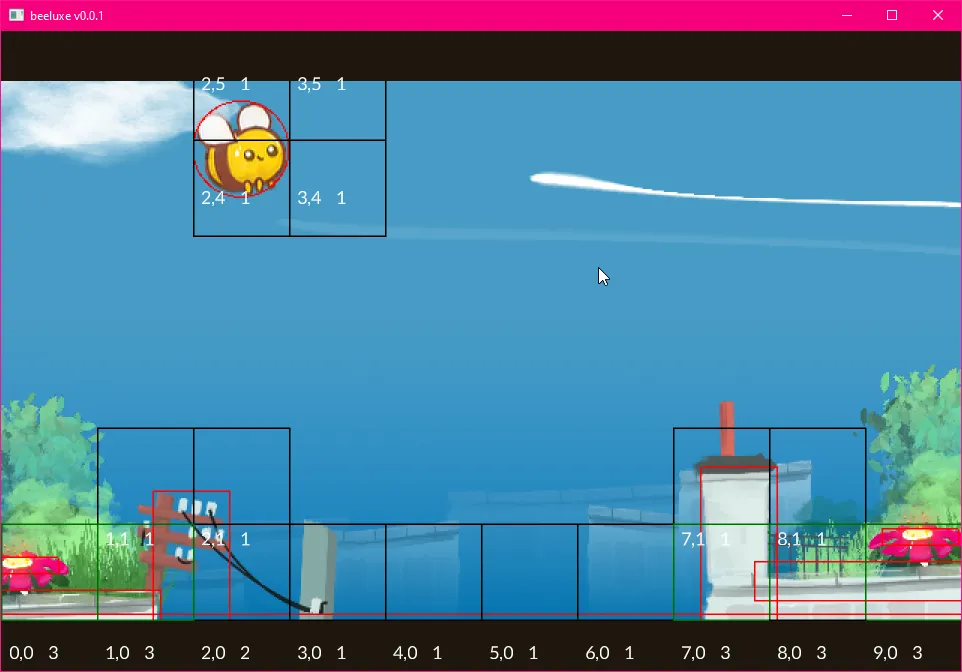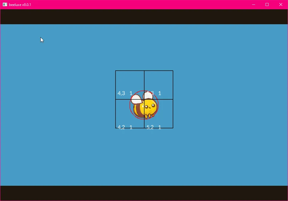 ...Arcade.set_radius(player, 32)Arcade.set_acc(player, [0, -200])Arcade.set_debug_draw_enabled(world, true)If you run this now, you should see the bee falling off the bottom of the world!