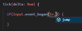 Instead, what we’ll do is make an enum-like class that makes our code easier to use, and gives us code completion and errors if we spell it wrong. The pattern is a static function that returns a string, so we’ll make one called In and a function called jump, so we can use In.jump to refer to the event name.