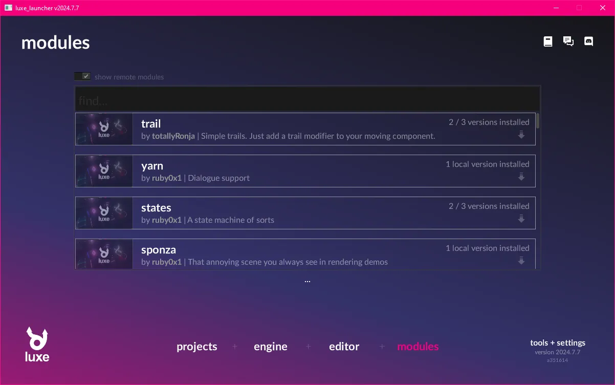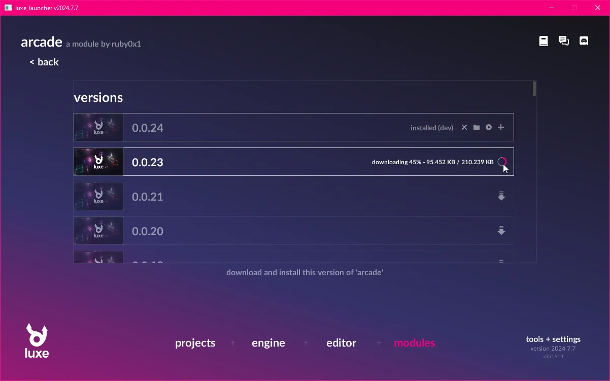 If you look inside of the luxe.project/modules.lx file you’ll find the luxe and arcade modules referenced by version.