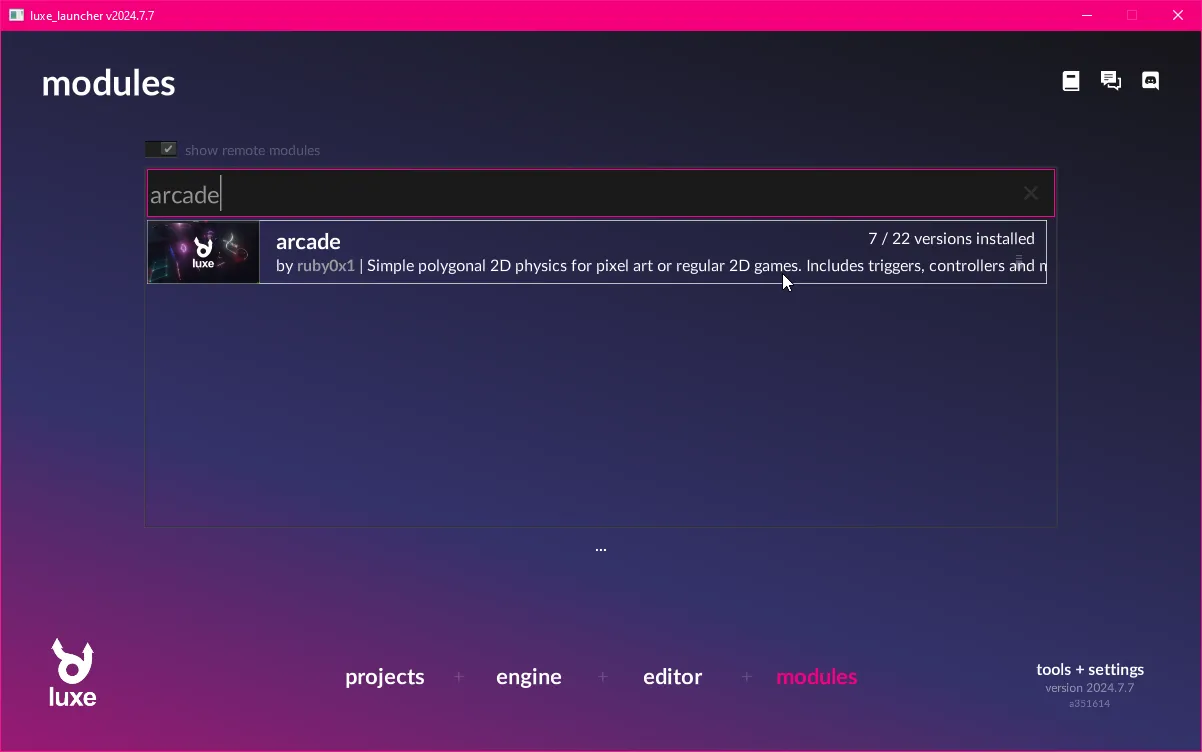 You can use the launcher to install modules. Head over to the module page, and search for the arcade module. Once you find it, you can click through, and click the download arrow.