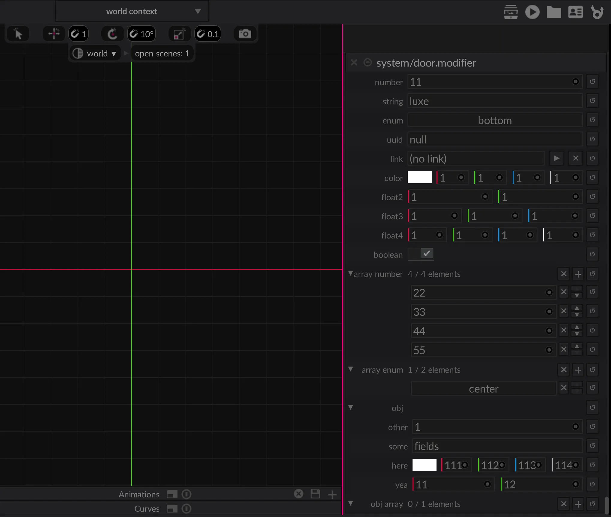 #display = "Number (count)" var number : Num = 11 #display = "name" var string : String = "luxe" var enum : MyTextAlign = MyTextAlign.bottom //defined below var uuid : UUID = null var link : Link = null //a reference to an entity in the editor/scene var color : Color = [1,1,1,1] var float2 : Float2 = [1,1] var float3 : Float3 = [1,1,1] var float4 : Float4 = [1,1,1,1] var boolean : Bool = true