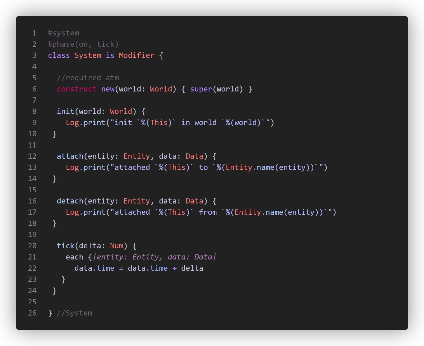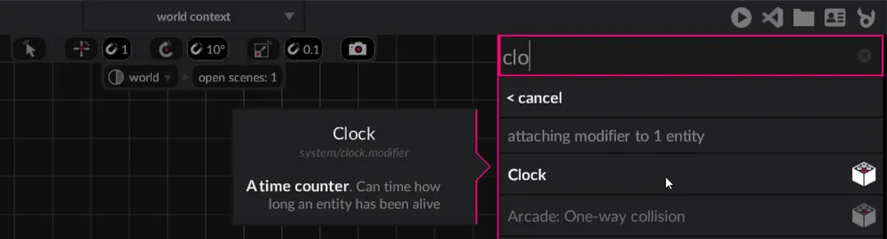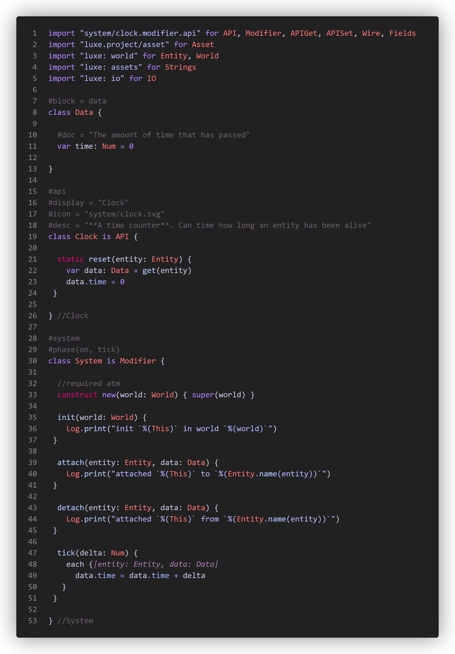 Section titled “How to define a modifier?”As an example, we’ll make a modifier that acts as a clock that adds up time. When you attach this to an entity, the entity will know how long it has been attached. If we attach it right when the entity is created, we can use it to tell how long the entity has been in the world.