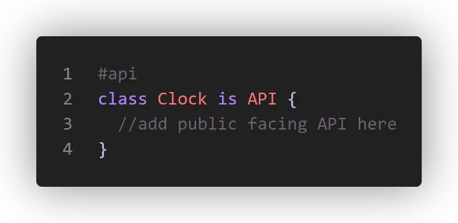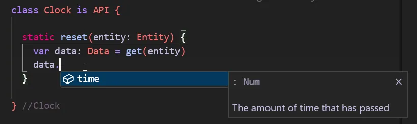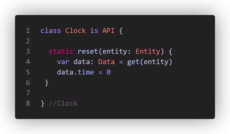 Section titled “The user facing API”Now let’s say we want to make it possible to reset the clock from the game code elsewhere - if you’ve followed along, you’ll notice the convention is a static API, which will be