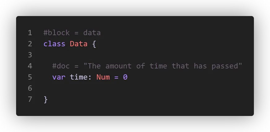 It uses a Wren class to define the fields of the data block, and has concrete types and rules that are a little special but power a ton of things. In this example we just need a single variable for time, so at the top of our modifier we have this simple definition: