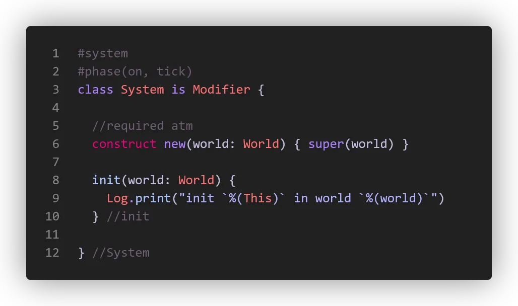 system(entity)which returns our system implementation, and other helpers too. You’ll often also find functions likeset_gravity(world: World, ...)where instead of speaking about the individual entity you’re speaking to the system itself, using the world as the key.