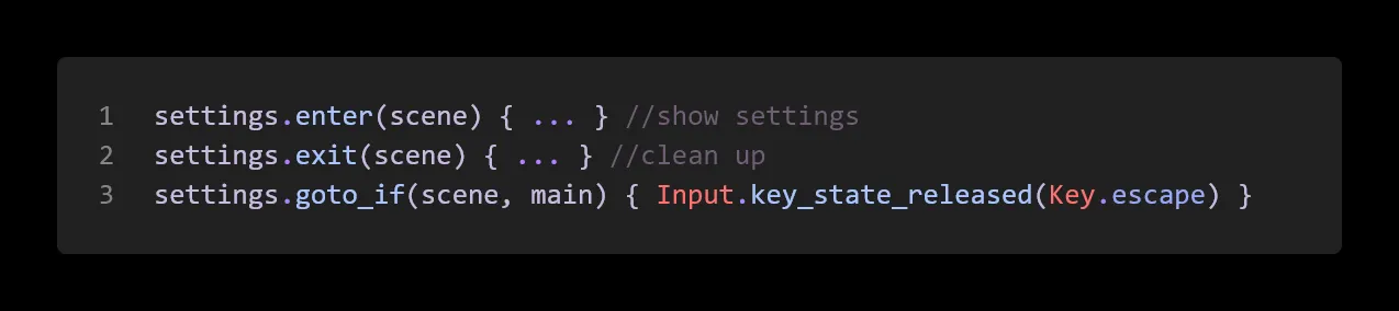 Our scene or system also has the states variable, which we use to change states directly like so states.goto(scene, main). We do that inside of ready() in a scene script to set the default state. We can also add behaviour to the state, like so: