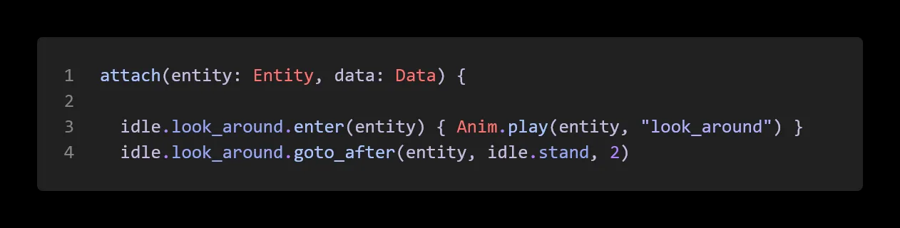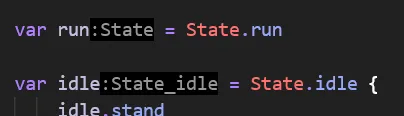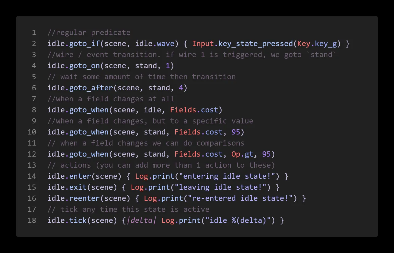 This API is declarative, this code doesn’t do anything per se, it just defines the state hierarchy for us! This also shows why we use the names, notice how the type of the idle variable is a known type.