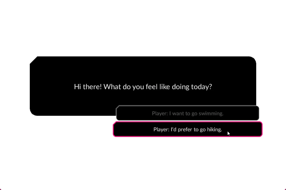 Section titled “Interaction”The dialogue will wait to progress until it’s told to continue. Your view can choose to automatically progress the dialogue as well internally.